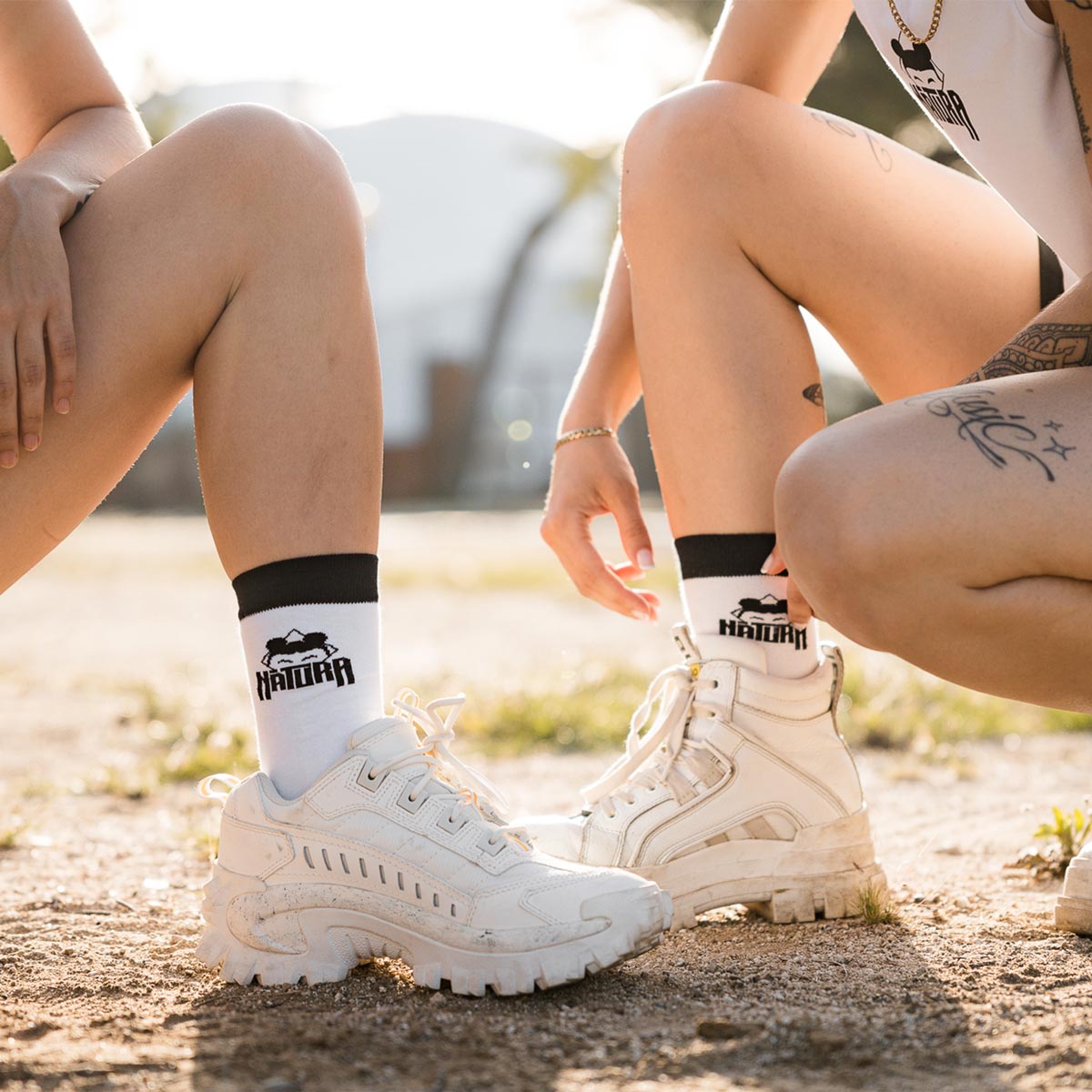 Calcetines blancos estampados con el logo de DJ Nàtura y detalles en blanco y negro.
