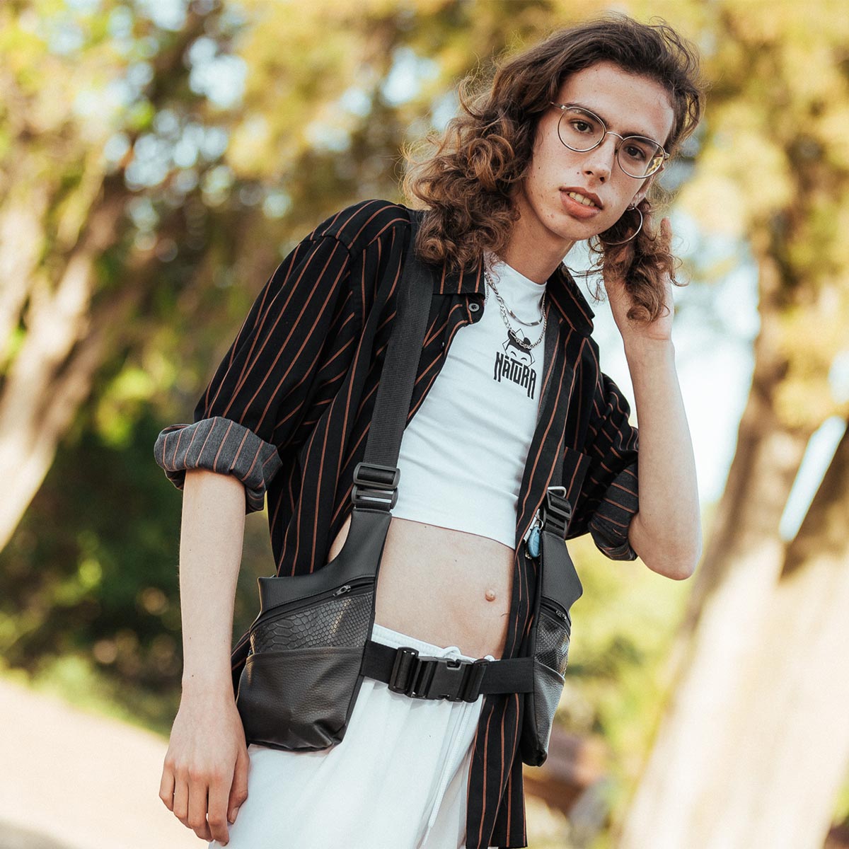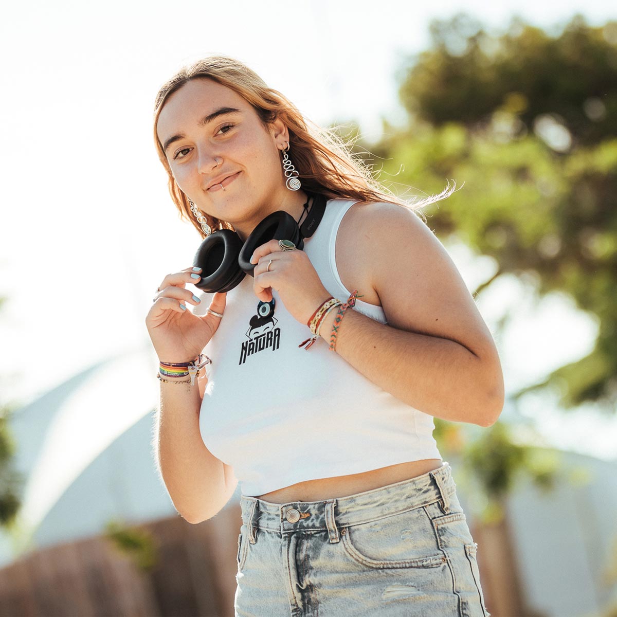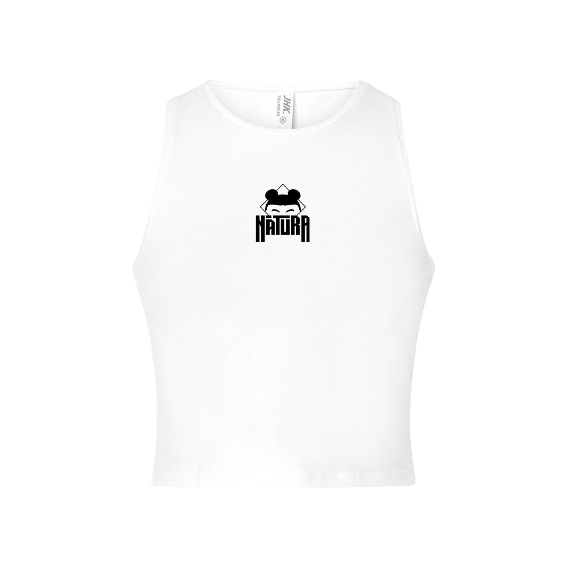 Top blanco de algodón con logo en el pecho y mensaje en la espalda.